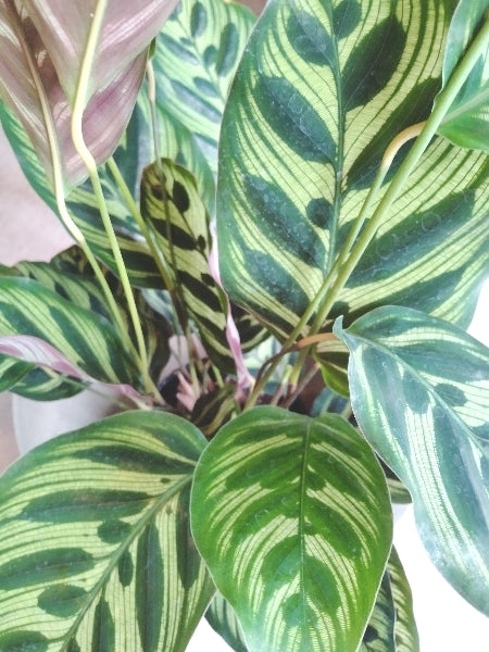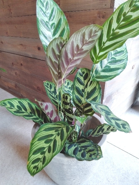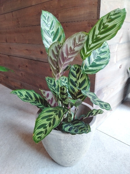 カラテア・マコヤナは、鮮やかな葉模様が特徴的な観葉植物です。葉の表面には緑と白の縞模様があり、裏側は鮮やかな紫色をしています。このユニークな見た目は、インテリアにアートのようなアクセントを加えるのに最適です。また、比較的育てやすく、日陰でも元気に育つため、室内での栽培に向いています。湿度を好むため、定期的な霧吹きで美しい葉を保ちましょう。