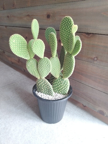 バニー・カクタスは、その愛らしいウサギの耳のような形状が特徴のサボテンです。小さな白いトゲが表面を覆い、インテリアにユニークで楽しいアクセントを加えます。乾燥に強く、比較的育てやすいので、初心者にもおすすめです。明るい場所を好みますが、直射日光を避けてください。水やりは控えめにし、土が完全に乾いてから行うのがポイントです。