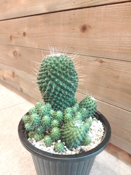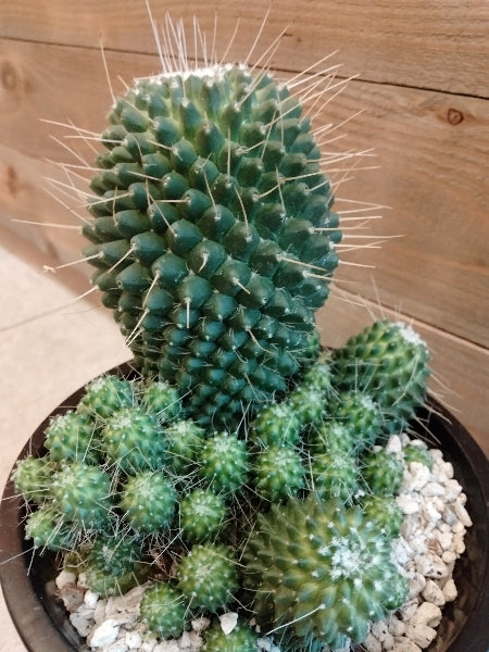 マミラリア・ピコ・ モンストは、独特の丸い形と柔らかい棘で人気のある観葉植物です。このサボテンはコンパクトなサイズで、デスクや窓辺にぴったり。水やりは控えめで育てやすく、乾燥した環境にも強いです。日光を好みます。初心者から経験者まで、どなたでも楽しめる植物です。