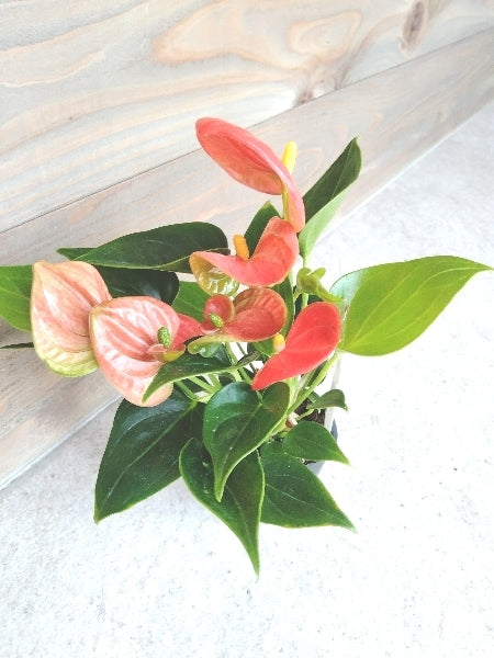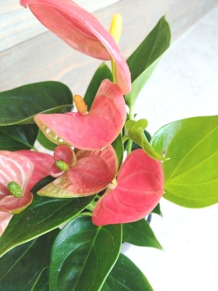 鮮やかな“花”に見える部分は実は仏炎苞(ぶつえんほう)。光沢のある赤やピンク、白などの苞が長く楽しめ、インテリアに華やかさをプラスしてくれるアンスリウム。熱帯アメリカ原産のサトイモ科植物で、南国リゾートを思わせるエキゾチックな雰囲気が魅力です。